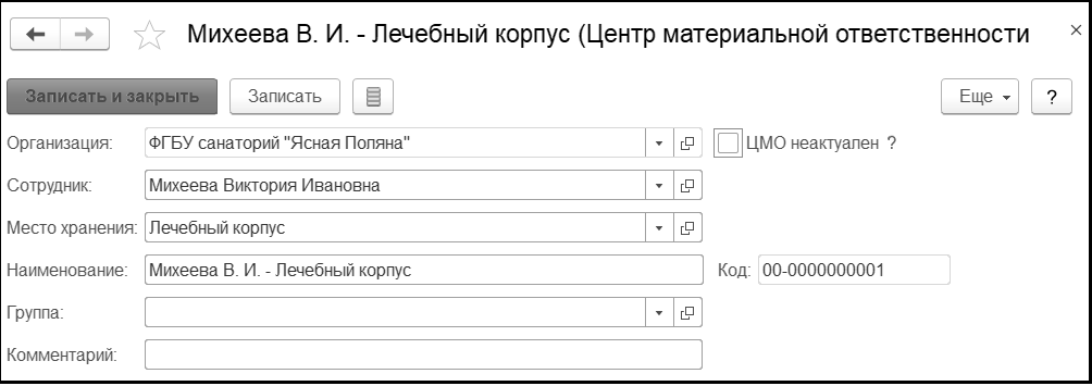 МОЛ / Место хранения – Михеева В.И. (из справочника Центры материальной ответственности)