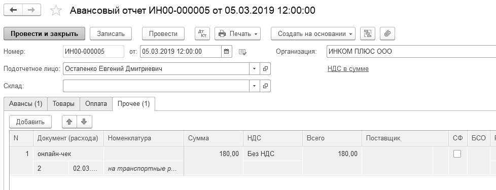 05.03.2019 года представлен авансовый отчет о транспортных (представительских) расходах. Представлен онлайн-чек № 2 от 02.03.2019 года.