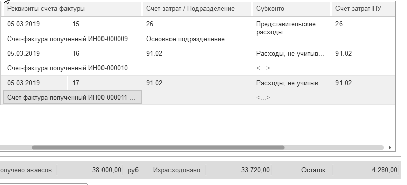 После проведения документа "Авансовый отчет" в программе регистрируются документы "Счет-фактура полученный".