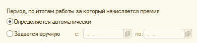 Если в документе выбирается премия процентная, то необходимо указать базовый период, за который премия будет рассчитываться. Период может определяться автоматически, исходя из настроек начисления, либо вручную.