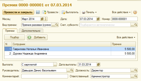 Сотрудницам Гавриловой и Дуровой 07.03.14 начислена разовая премия суммой в размере 5500 руб. Зарегистрируем данные начисления документом "Премии".