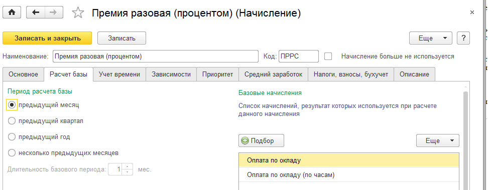 Пример. Если в программе начисляется разовая премия процентом от заработка прошлого месяца, то при добавлении начисления указывается соответствующий порядок расчета базы.