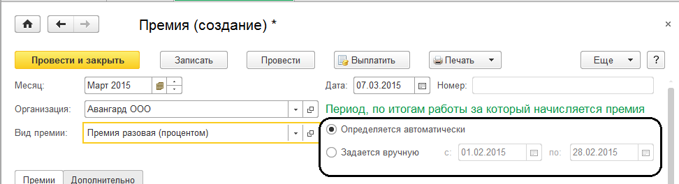 В документе «Премия» базовый период по умолчанию будет определяться автоматически и при необходимости его можно будет скорректировать вручную.