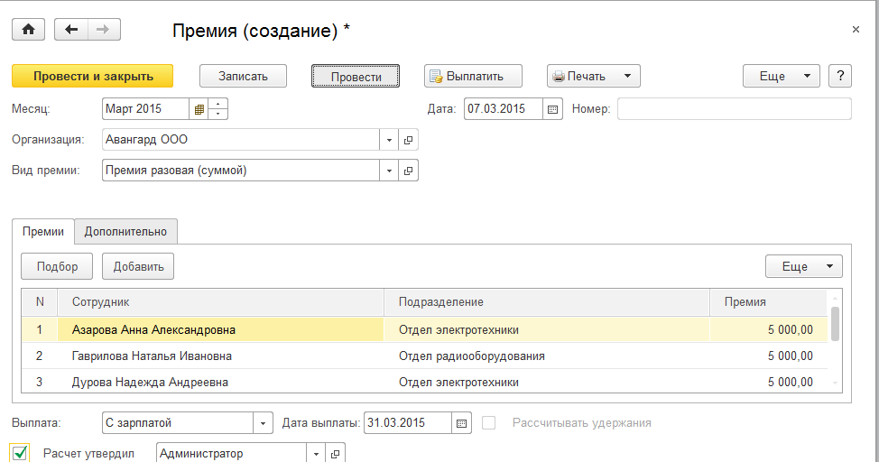 Если в документе выбирается премия, задаваемая фиксированной суммой, то для сотрудников достаточно указать сумму премии.