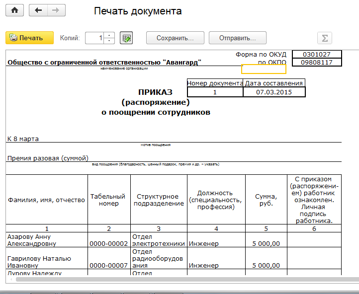Проведем документ. Выведем на печать приказ о премировании по форме Т-11а.