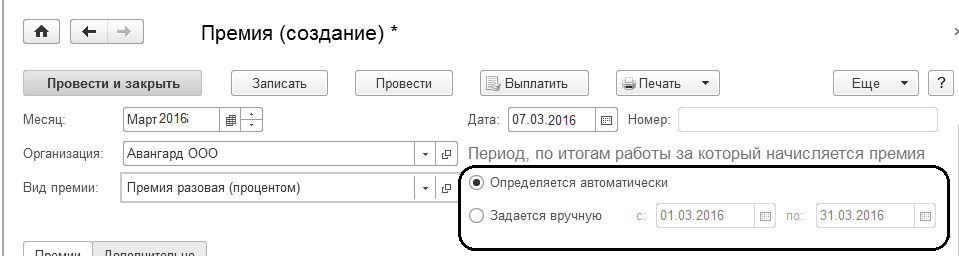 В документе "Премия" базовый период по умолчанию будет определяться автоматически и при необходимости его можно будет скорректировать вручную.
