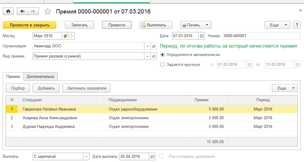 Если в документе выбирается премия, задаваемая фиксированной суммой, то для сотрудников достаточно указать сумму премии.