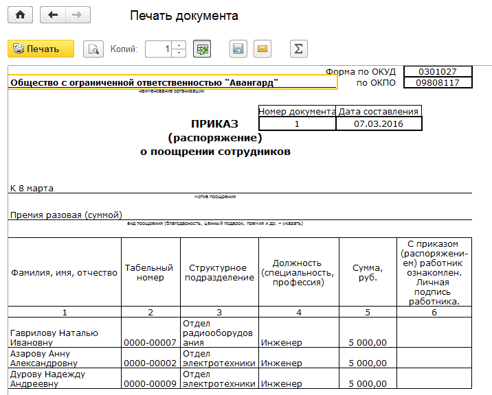 Проведем документ. Выведем на печать приказ о премировании по форме Т-11а.