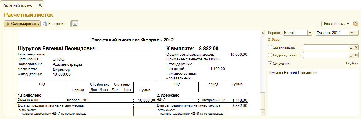 В отчете (рис. 12-34) будет показано, что Шурупову Е.Л. в феврале начислено 10000.00 руб., с начисленной суммы исчислено к удержанию 988 руб. налога на доходы физических лиц. Задолженность перед работником на конец месяца составляет 9012.00 руб. именно эта сумма и была выплачена Шурупову Е.Л. 03.03.2012 (см. документ Зарплата к выплате организаций № 1 за 28.02.2012).