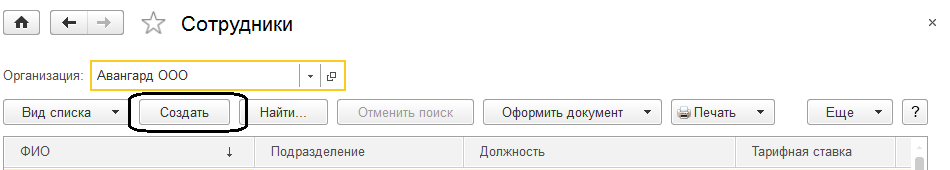 1. Составим список сотрудников для приема на работу списком в ООО "Авангард". Воспользуемся способом №2, рассмотренным выше, для добавления новых сотрудников.