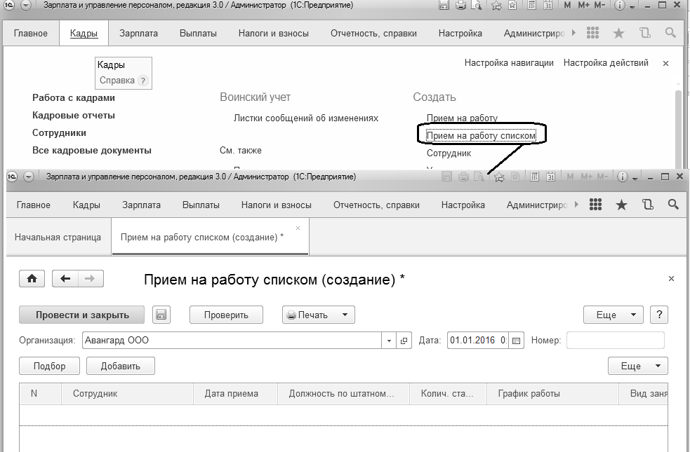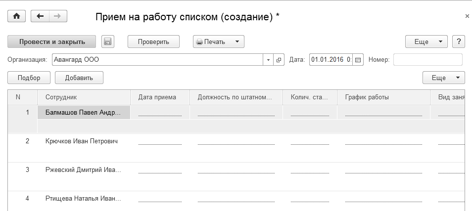 Прежде чем заполнять списочный прием на работу, следует создать сотрудников (и физических лиц) в соответствующих справочниках.