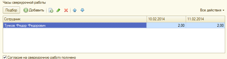Сотрудник Тучков Ф.Ф., начальник отдела, со своего согласия отработал 10 и 11 февраля по 2 часа сверхурочно (производственная необходимость). Зарегистрируем приказ на сверхурочные работы сотруднику.