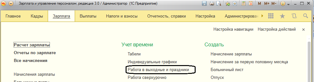 - Повышенная плата – в этом случае на основании введенного времени автоматически выполняется "выстреливающее" начисление "Оплата праздничных" в документе "Начисление зарплаты" (сразу с двойной оплатой).