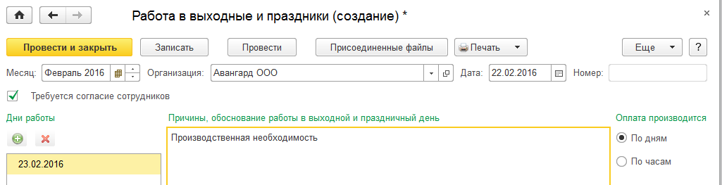- Расчет работы в выходной и праздничный день может производиться как в днях, так и в часах.