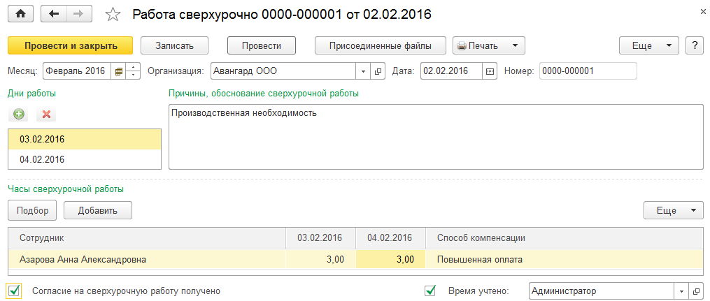 Документ регистрирует данные для учета отработанного времени. Оплата же за это время зависит от выбранного способа компенсации работы сверхурочно: