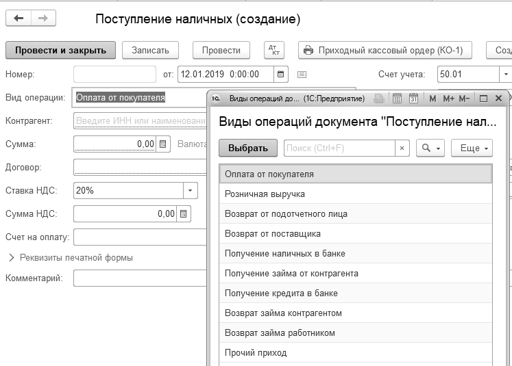 Рис. 6.1.1. Электронная форма документа "Поступление наличных"