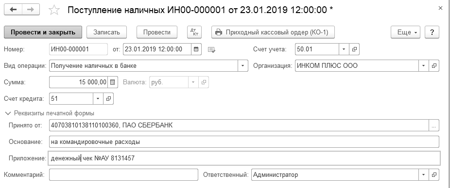 23.01.2019 года из банка с расчетного счета поступили в кассу организации "ИНКОМ ПЛЮС" денежные средства на командировочные расходы в сумме 15 000 руб. по денежному чеку №АУ 8131457.