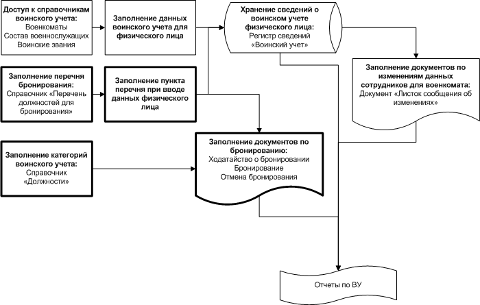 Сама же схема воинского учета дополняется объектами и настройками, связанными с бронированием (см. рисунок ниже, дополнения выделены жирной линией).