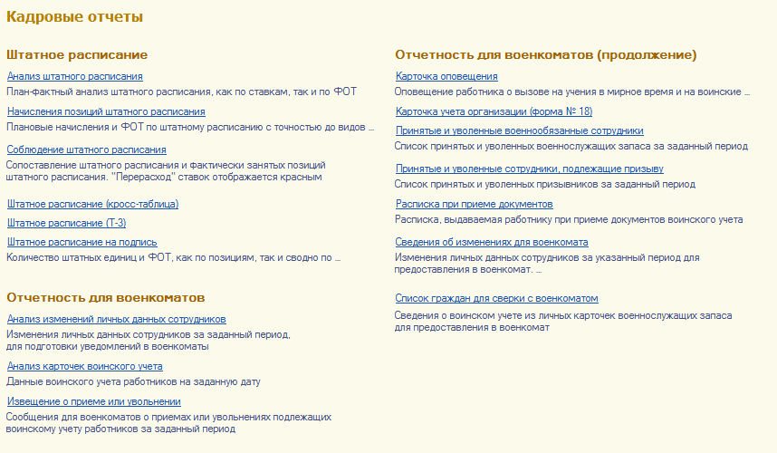 - В кадровых отчетах доступны различные отчеты по данным военных билетов.