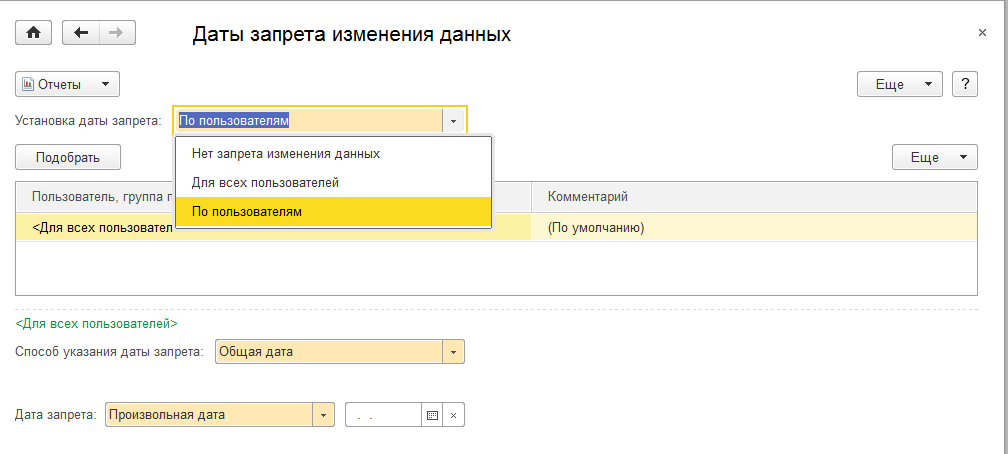 • Дата запрета изменения данных - установка запрета изменения данных прошлых периодов для пользователей этой программы. Дата запрета может устанавливаться как для всех пользователей, так и для каждого пользователя/группы пользователей в отдельности. Кроме того, можно устанавливать дату запрета для разделов и организаций. При установке даты запрета следует учитывать, под действие данного ограничения попадают данные, период действия которых ограничен концом предыдущего дате запрета дня. То есть, например, при установке значения 31.12.2013, изменение данных будет возможно только, начиная с 01.01.2014 00:00:00 включительно.