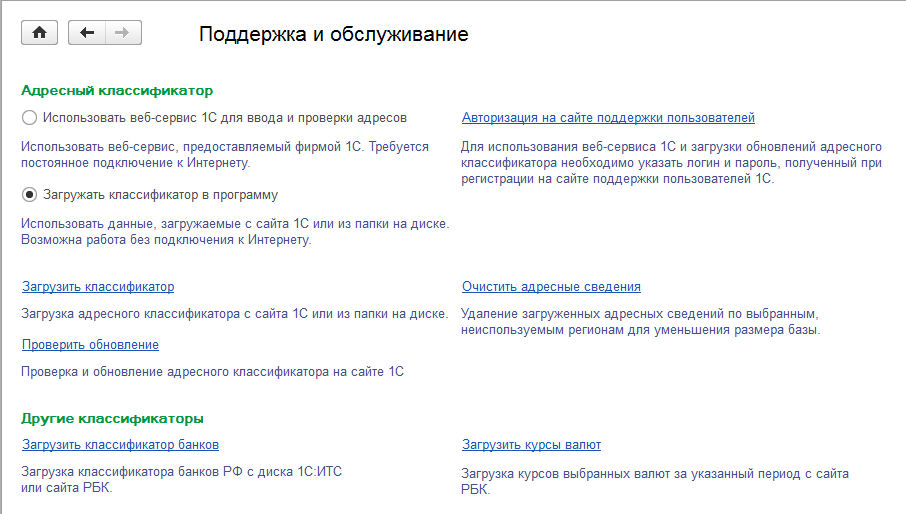 • При использовании веб-сервиса 1С – в этом случае элементы адреса не загружаются в информационную базу, а проверяются он-лайн. Такой вариант потребует постоянного подключения к сети Интернет и авторизации на сайте поддержки пользователей;