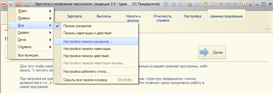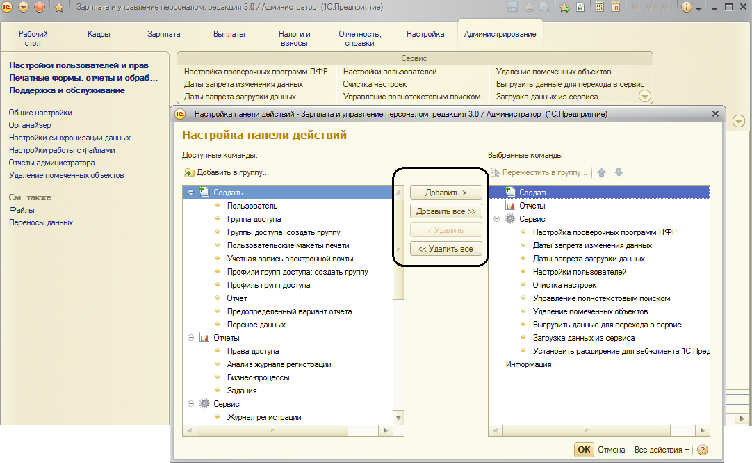 Панель действий может настраиваться пользователем самостоятельно. Настройка осуществляется для каждого раздела отдельно по команде "Главное меню / Вид / Настройка панели действий".