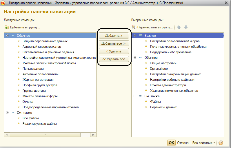 Панель навигации пользователь также может настраивать отдельно для каждого раздела по команде "Главное меню / Вид / Настройка панели навигации": добавлять команды в раздел "Важное" (выделяется жирным цветом), обычное, и дополнительные данные (См. также).