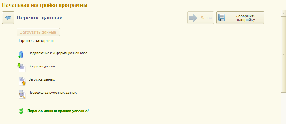 После успешного завершения переноса, если стартовый помощник более не требуется, можно завершить настройку программы и перейти к проверке перенесенных данных.
