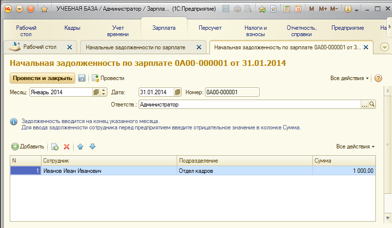 Задолженность организации перед сотрудником (т.е. невыплаченная зарплата) вводится на конец указанного месяца, если же сотрудник должен организации, то сумма указывается с отрицательным знаком. Сумма задолженности будет учтена при ближайшей выплате зарплаты.