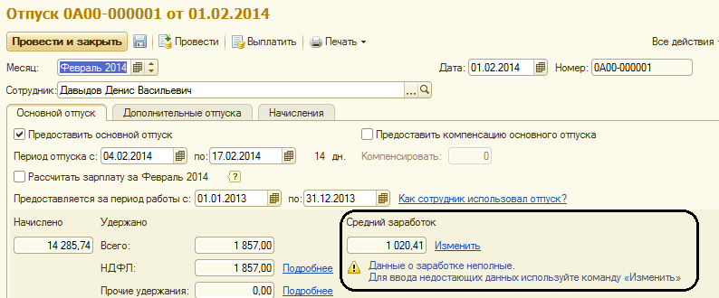 Необходимые данные для расчетов по среднему заработку (для расчета больничных и отпусков) можно будет уточнить вручную непосредственно в документах по команде "Изменить".