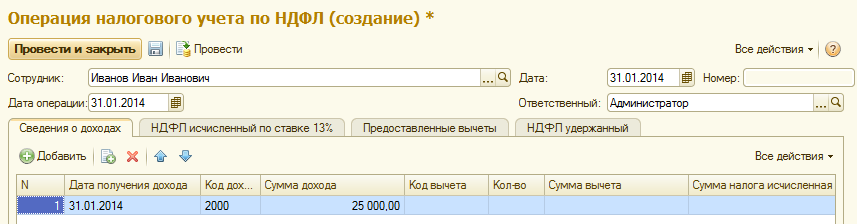 • Операция налогового учета по НДФЛ – здесь помесячно указывается налоговая база, коды доходов и суммы доходов, на отдельных закладках вносится НДФЛ исчисленный, НДФЛ удержанный и фактически предоставленные вычета.