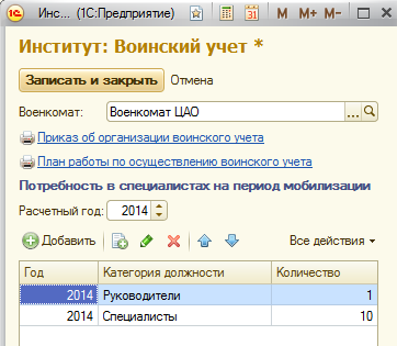 Кроме того, в программе поддерживается ведение учета граждан, стоящих на специальном воинском учете, забронированных за организацией на период мобилизации и на военное время.
