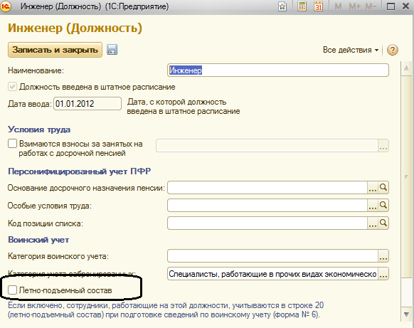 Кроме того, если включены настройки учета должностей летно-методического либо плавсостава, появляется возможность ввести соответствующие уточнения для должности (для заполнения строк унифицированных форм воинского учета).