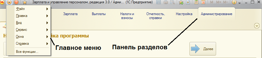 Панель разделов – каждый раздел представляет собой меню, которое дает доступ к объектам программы.