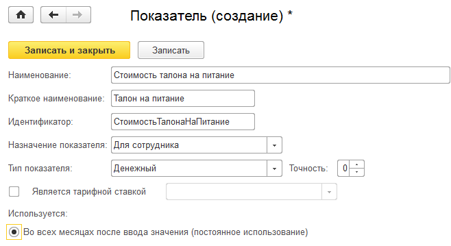 Зададим формулу для этого начисления. Нам потребуется создать новый показатель – стоимость дневного талона на питание. Показатель может быть настроен двумя способами: