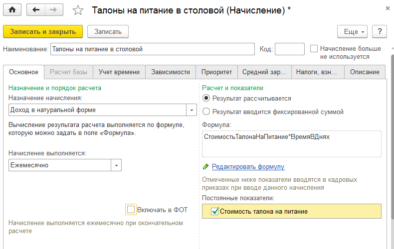 1й способ – для сотрудника, тогда стоимость талона указывается при назначении начисления непосредственно каждому сотруднику