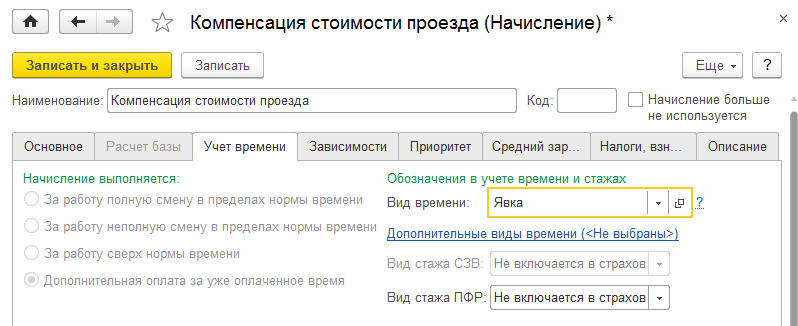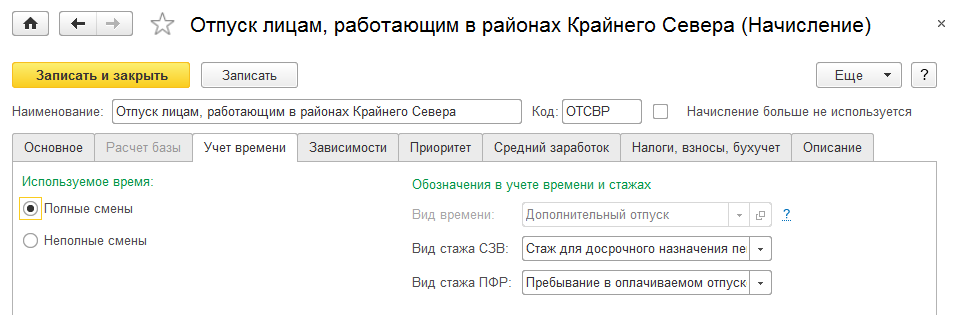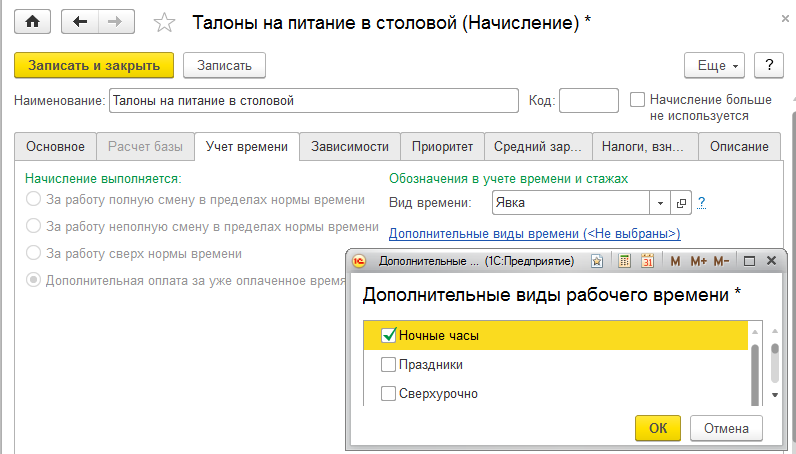 Для начислений, характеризующих систему оплаты труда (оклад, сделка), настройки учета времени устанавливаются за работу полную смену в пределах нормы времени (реже – неполную смену в пределах нормы времени).