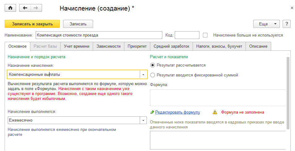 Зададим формулу для этого начисления. Нам потребуется создать новый показатель – компенсация проезда в день. Показатель может быть настроен двумя способами: