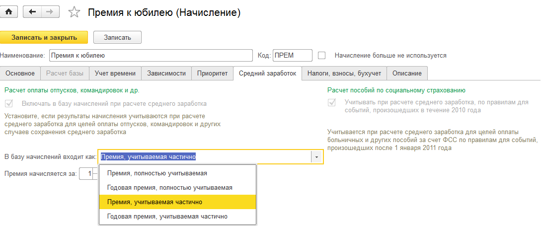 Особенностью данных начислений является отдельная настройка для среднего заработка, позволяющая регулировать порядок вхождения в его базу.