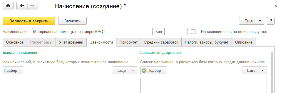 Отредактируем закладку "Зависимости" - считаем, что начисление не будет входить в базу данных никаких начислений и удержания.