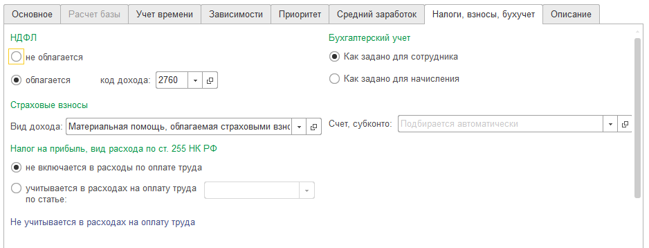Начисления с этим назначением всегда облагаются страховыми взносами в фонды, а настройка налогообложения по умолчанию устанавливается: код НДФЛ 2000 (также доступны 2760 и 4800) и п.1 ст.255 для учета налога на прибыль (другие пункты также доступны).