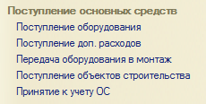 Для отражения в бухгалтерском и налоговом учете операции, отмеченной на схеме цифрой 1, необходимо воспользоваться документом типовой конфигурации «Принятие к учету ОС». Журнал документов открывается