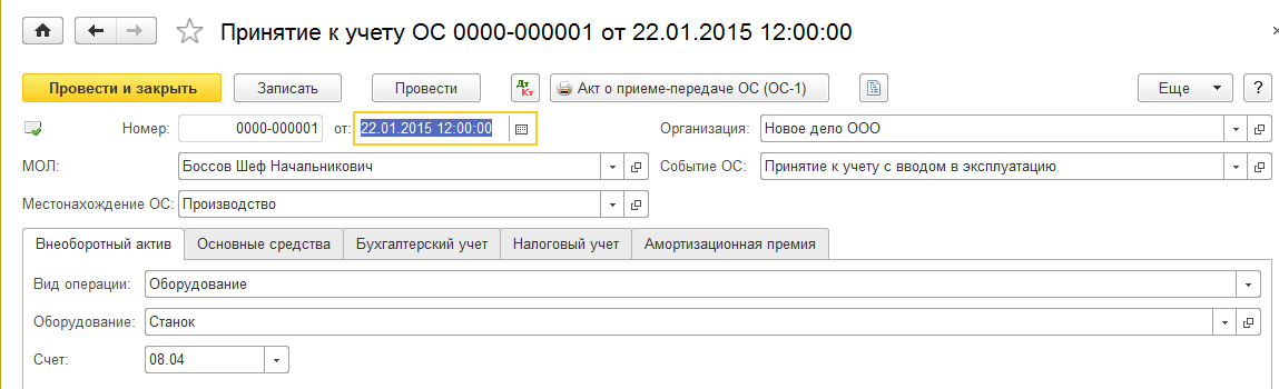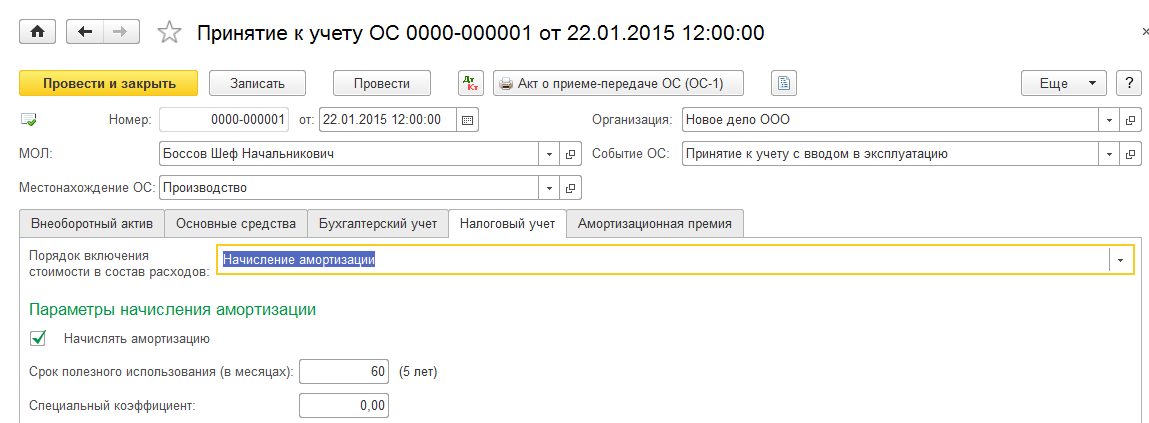Справочник «Основные средства» содержит основные сведения об объекте ОС. Кроме того, большинство сведений об основном средстве, относящихся к бухгалтерскому и налоговому учету, заполняются только с помощью документа «Принятие к учету ОС».