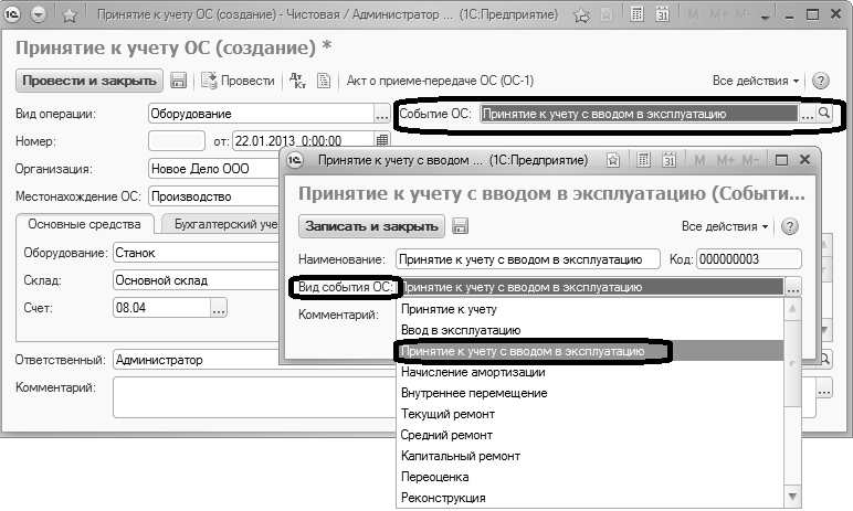 В шапке документа «Принятие к учету ОС» также указываются сведения о событии с основным средством на момент ввода документа.