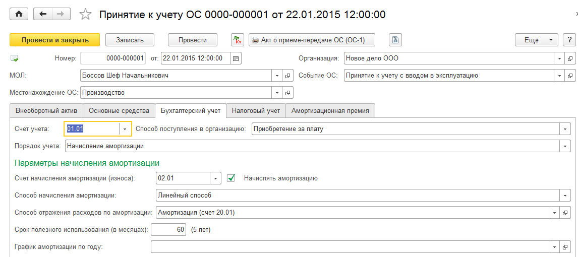 На закладке «Бухгалтерский учет» указываются основные сведения о порядке учета основного средства и начислении амортизации.