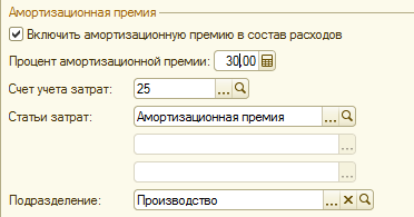 Организации имеют право включать в состав расходов текущего отчетного (налогового) периода расходы на капитальные вложения в размере до 10% либо до 30% от первоначальной стоимости основных средств (для третьей-седьмой группы). Исключение составляют основные средства, полученные безвозмездно. На такие объекты право на амортизационную премию не распространяется. Данные параметры указываются в документе при установленной настройке «Включить амортизационную премию в состав расходов»: