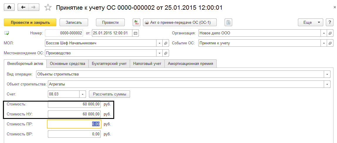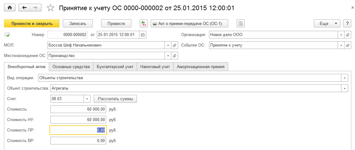 Если принимается к учету одновременно несколько однотипных основных средств с одинаковым СПИ, методом начисления амортизации и т.д. одним документом, то и стоимость их должна быть одинакова. В этом случае по кнопке «Рассчитать суммы» программа просто вытаскивает всю накопившуюся сумму на счете 08.03. Если не придать значения этому реквизиту и провести документ, тогда получится, стоимость агрегата 1 будет 100 000 руб. и стоимость агрегата 2 будет также 100 000 руб. Итого суммарно 200 000 руб. будет отражено в проводках по Кт 08.03, в то время как по Дт счета 08.03 всего накопилось на сумму 100 000. Налицо ошибка в учете. Контроля на корректность указания сумм в этом документе не предусмотрено. А потому необходимо пользователю самостоятельно всю сумму, которая накопилась на счете 08.03 и которую программа подтягивает по кнопке «Рассчитать суммы» разделить на то количество основных средств, которое мы получим на выходе и вручную ее установить.