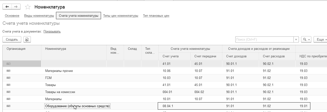 Рис. 10.1.1. Обращение к регистру сведений "Счета учета номенклатуры" для номенклатурной группы "Оборудование (объекты основных средств)"