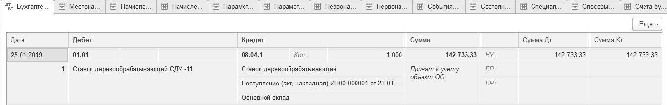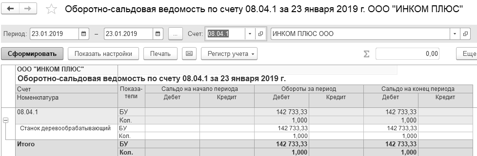 Проведите документ. Проверьте, собралась ли на счете 08.04.1 "Станок деревообрабатывающий" сумма 142 733,33 руб. Для этого, надо сформировать отчет "Оборотно-сальдовую ведомость по счету" 08.04 за январь 2019 года.