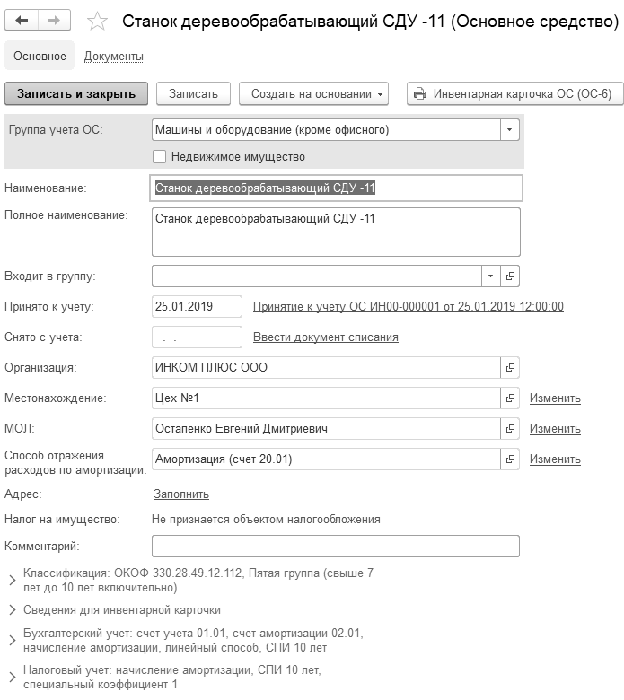 В табличной части основных средств заводим новый элемент "Станок деревообрабатывающий СДУ -11".